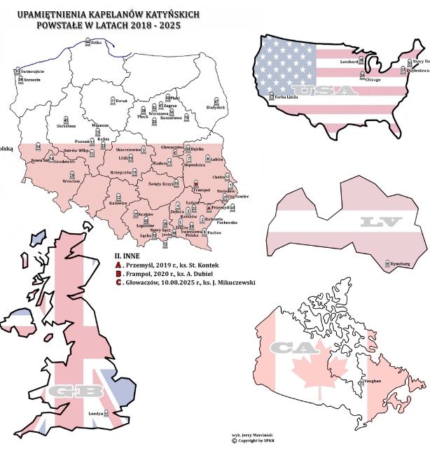 W latach 2018 – 2025 powstało wiele miejsc upamiętnień Kapelanów Katyńskich w Polsce i na całym świecie. Zapoznaj się z mapą, graficznym przedstawieniem miejsc, w których upamiętnia się duszpasterzy Wojska Polskiego zamordowanych w 1940 roku na Wschodzie.