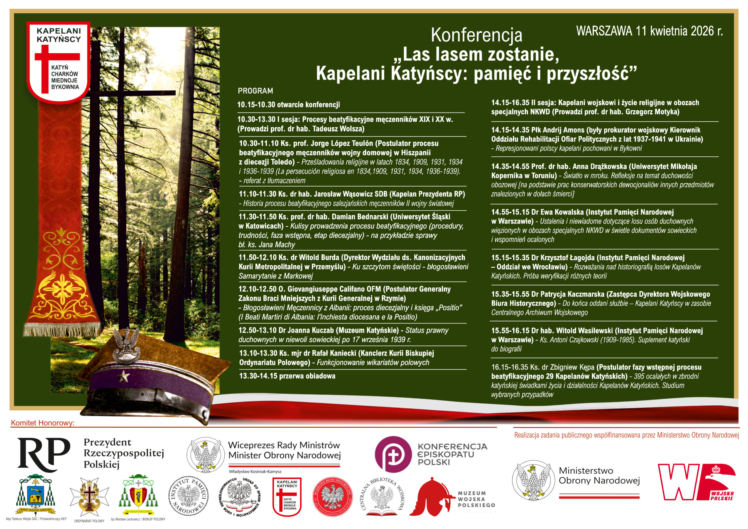 W sobotę 11 kwietnia 2026 roku zorganizowaliśmy konferencję zatytułowaną „Las lasem zostanie, Kapelani Katyńscy: pamięć i przyszłość”. Wydarzenie rozpoczęło się Mszą św. o godz. 9.00 w katedrze polowej Wojska Polskiego Najświętszej Maryi Panny Królowej Polski. Następnie w Sali Tradycji Ordynariatu Polowego odbyła się konferencja.