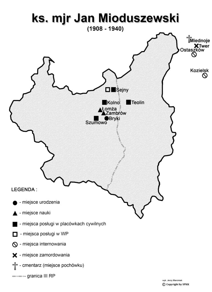 We wspomnieniach rodziny mieszkającej w Sejnach w latach międzywojennych i po wojnie wiadomo, że Ksiądz Jan Mioduszewski w czasie pracy w Sejnach od 1.09.1938 r. do wybuchu wojny z Niemcami był wikariuszem w kościele parafialnym i ofiarnie służył nie tylko cywilnej ludności, ale także żołnierzom Wojska Polskiego kwaterującym w mieście i okolicy, oraz żołnierzom Korpusu Ochrony Pogranicza z Baonu KOP „Sejny”, którzy od 1924 r. strzegli granicy polsko-litewskiej.