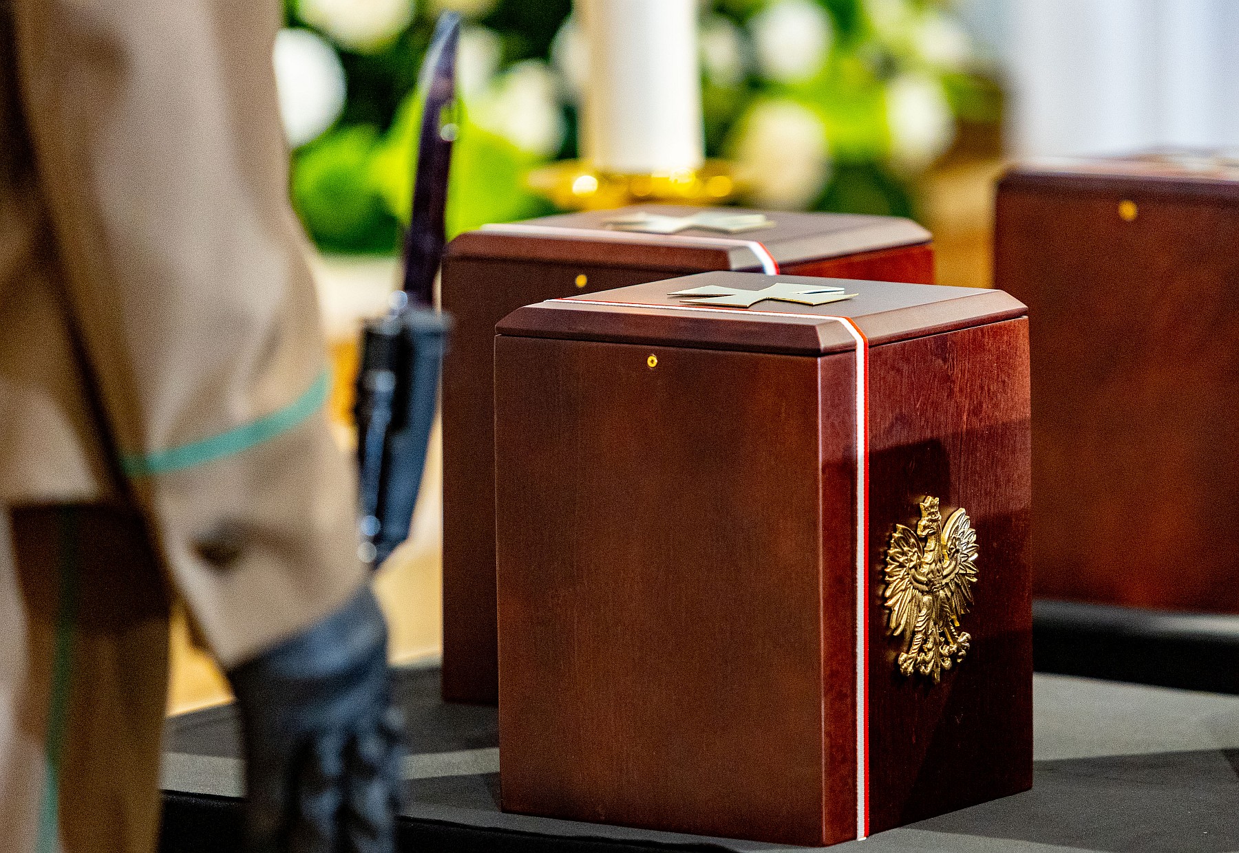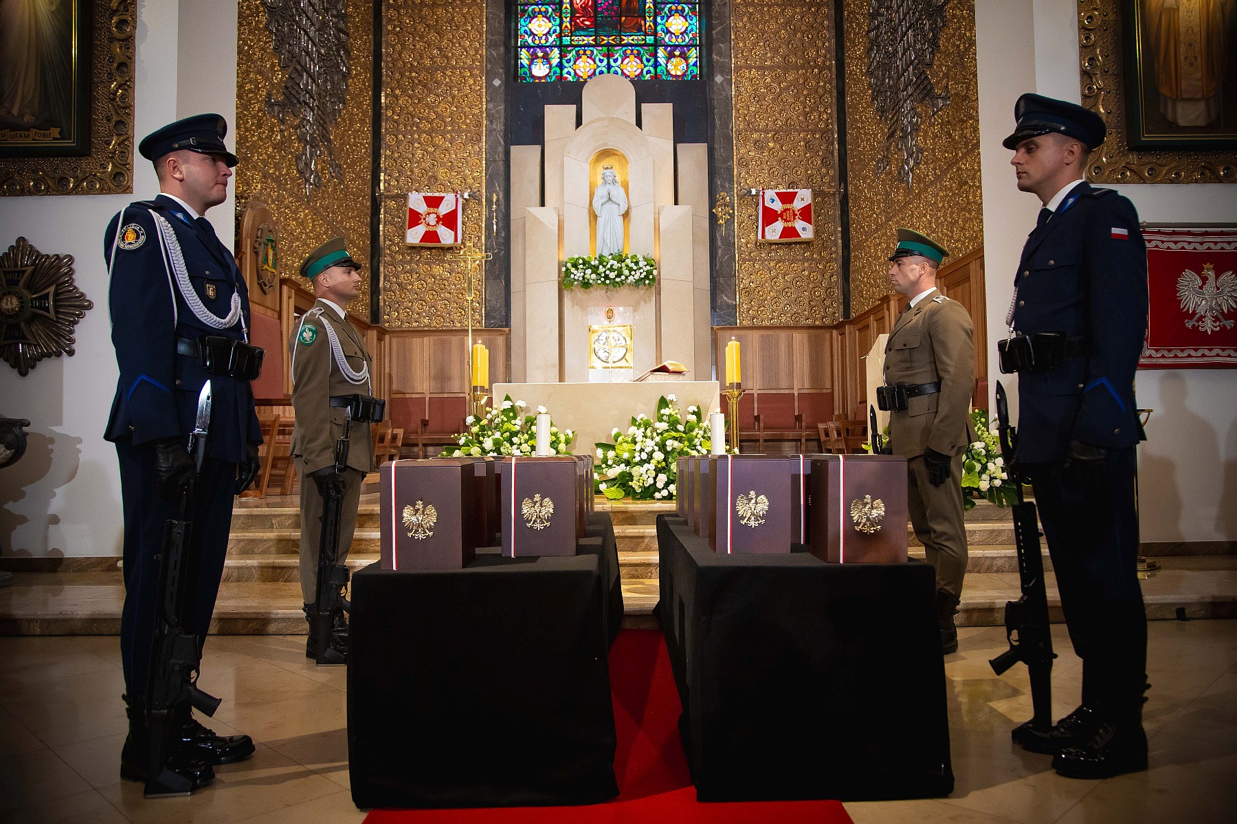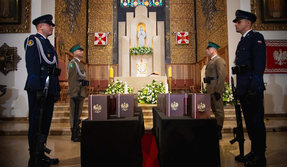 Trumny ze szczątkami ofiar zostały przeniesione przez żołnierzy oraz funkcjonariuszy Straży Granicznej, Służby Więziennej i Policji do krypty katedry polowej. Wieniec od narodu złożył prezydent Karol Nawrocki.